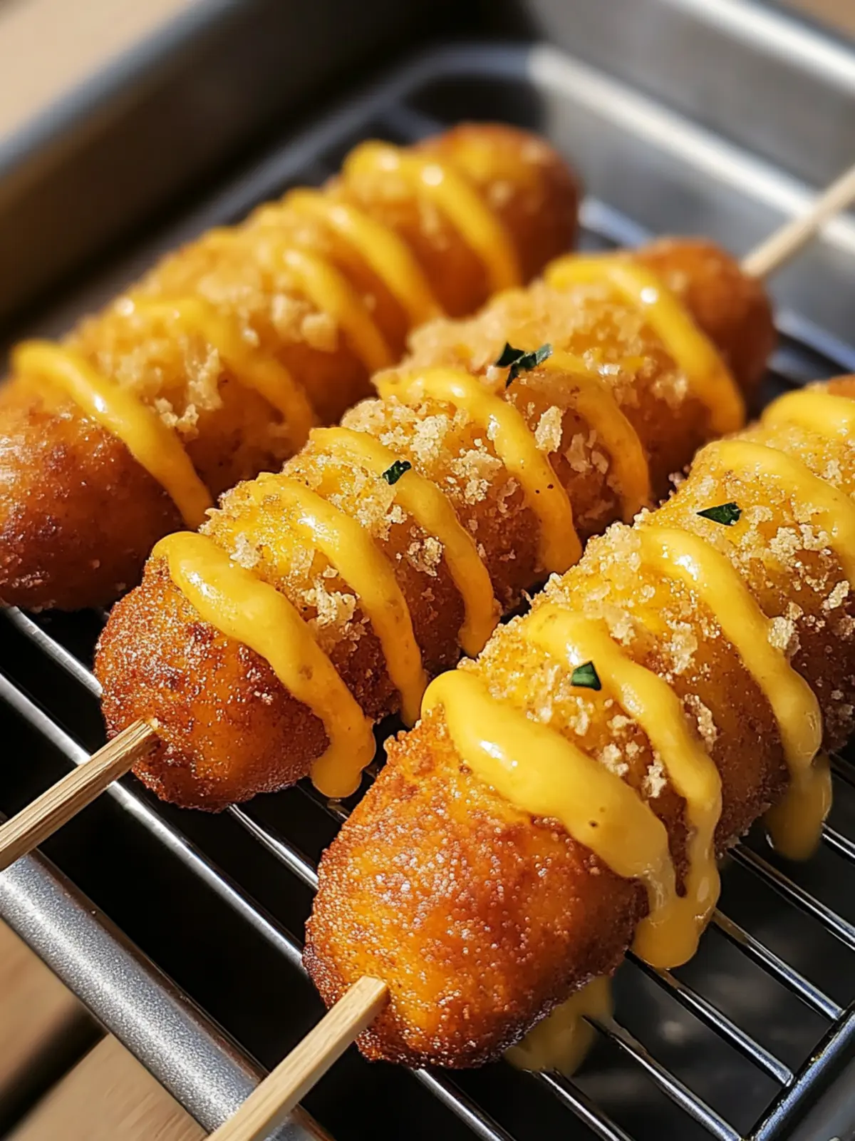 Cool the corn dogs slightly before inserting wooden skewers for easy handling. Serve warm to enjoy that melty, cheesy goodness!