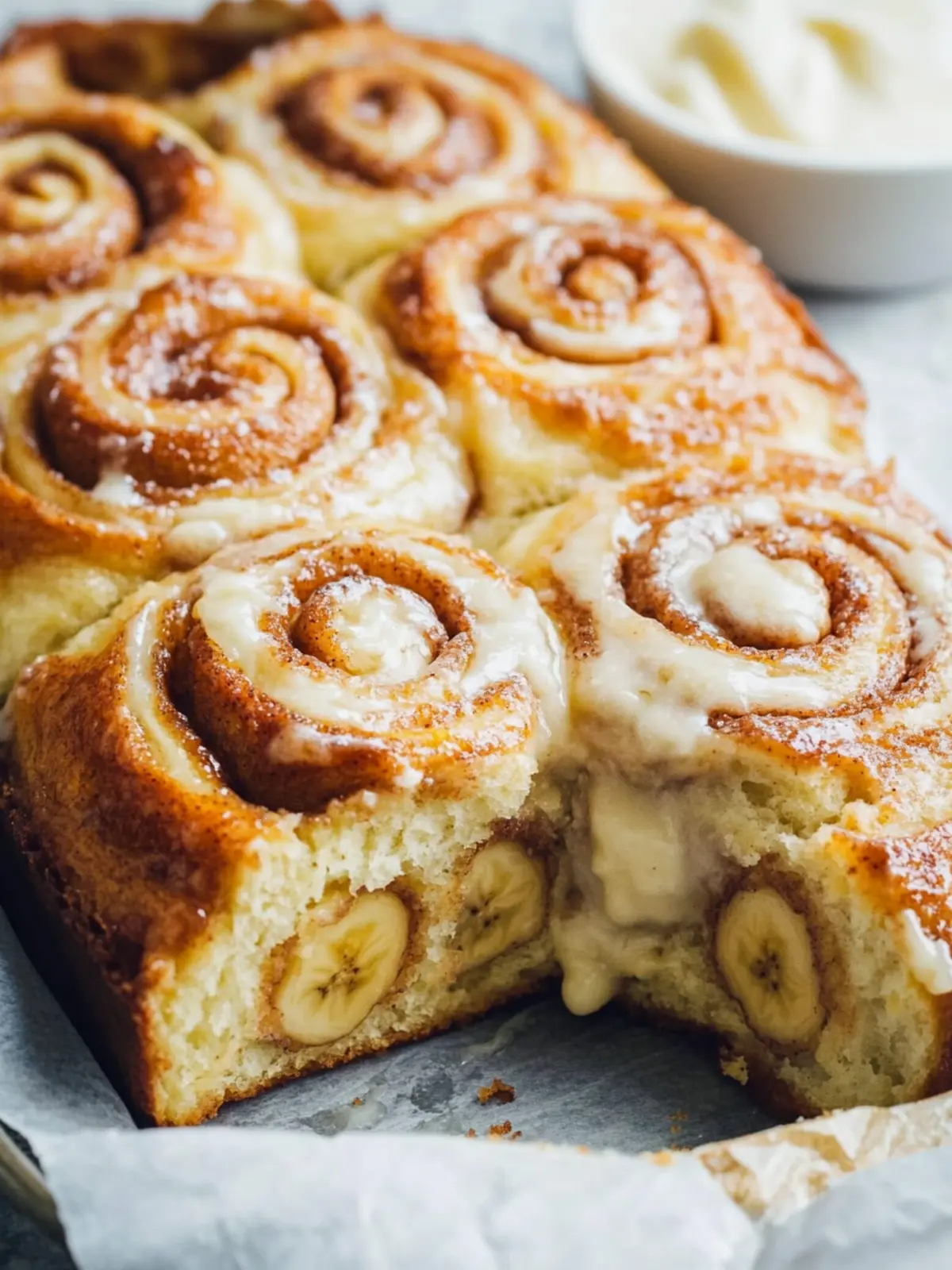 7. Prepare the Glaze: While the buns are baking, whip together cream cheese, heavy cream, and icing sugar in a bowl until smooth. Once the buns are out of the oven, ice them immediately with the glaze and top with extra sliced bananas.