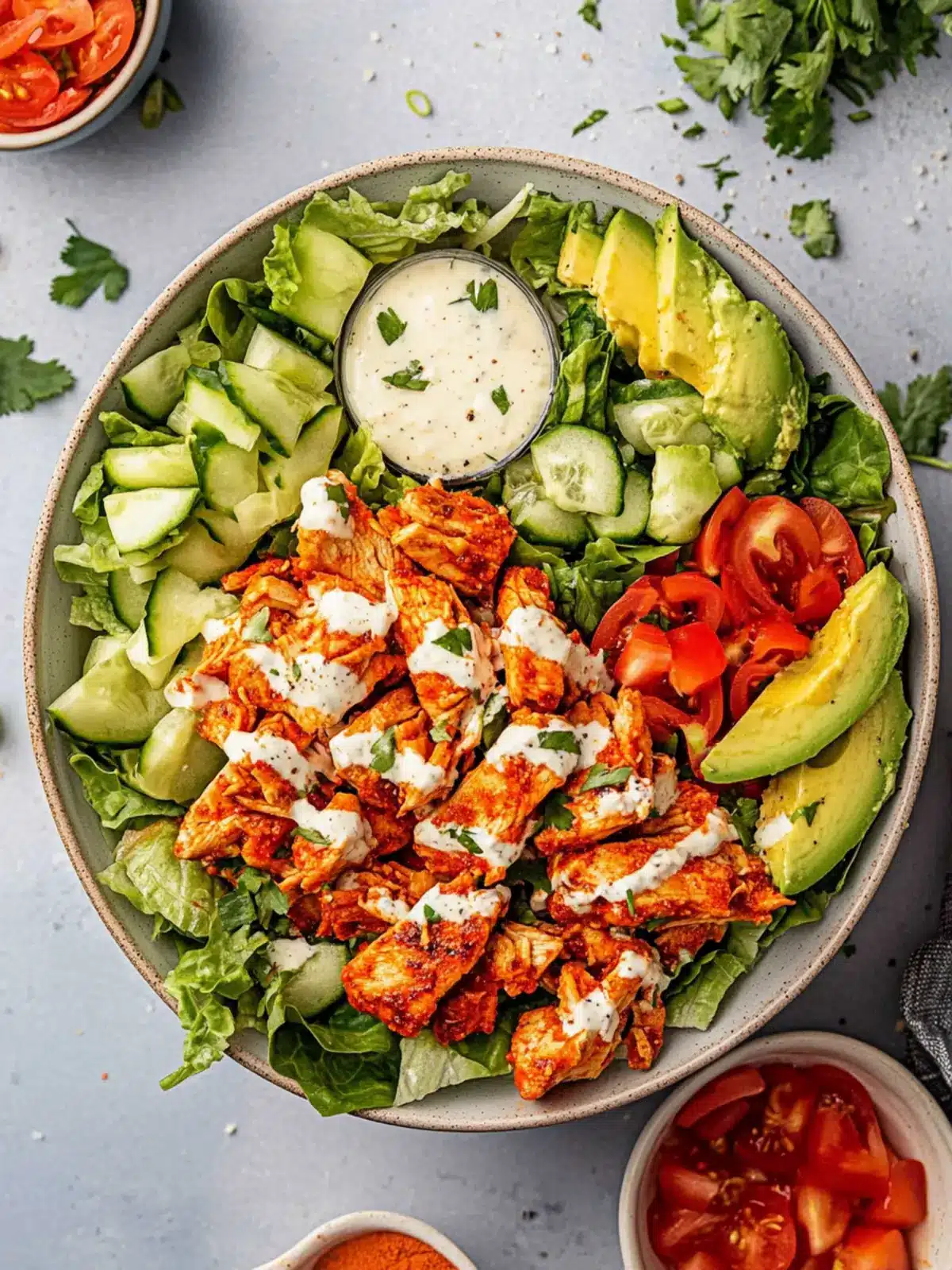 Vegan Option: Swap chicken with crispy baked tofu or chickpeas for a plant-based alternative, and use a tahini-based dressing instead of Greek yogurt.