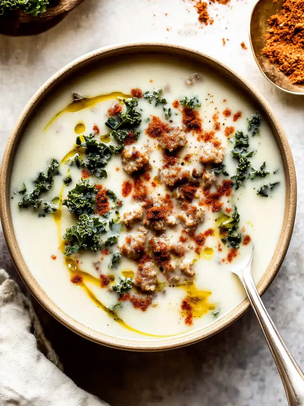 Add Cream and Greens: Stir in the half and half and bring the soup to a gentle simmer. Fold in the sausage, bacon, and chopped kale. Simmer until the kale is wilted, about 5 minutes. Taste and adjust seasoning as needed. Serve with a sprinkle of red pepper flakes for that extra kick.