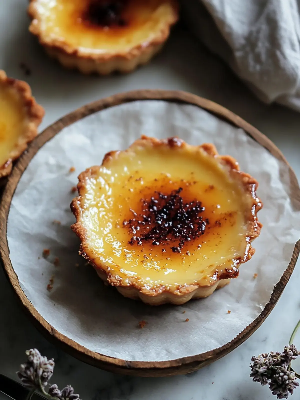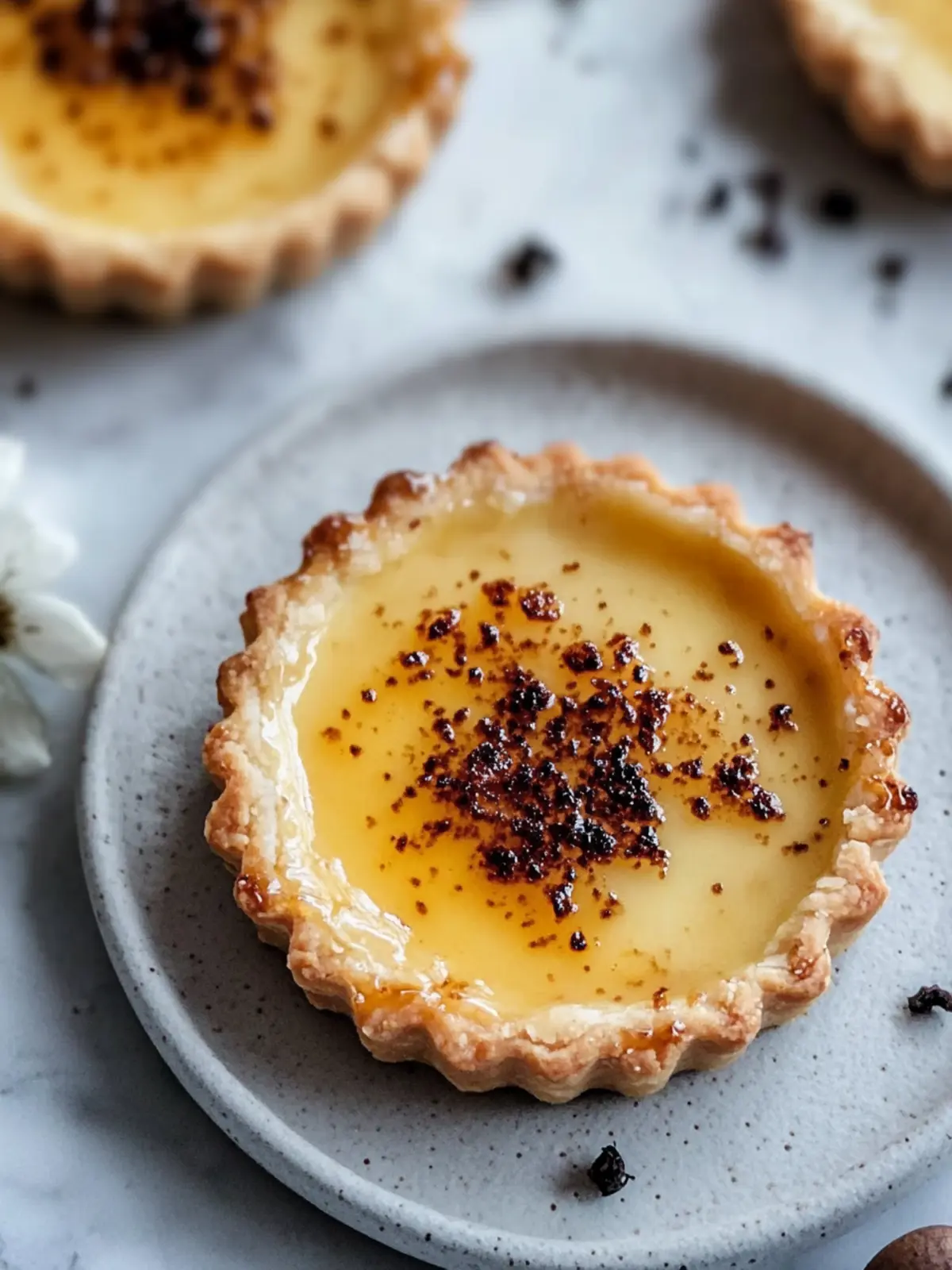 Assemble Tartlets: Fill the baked tart shells with the chilled custard, sprinkle a generous layer of sugar on top, and caramelize it gently using a kitchen blowtorch just before serving for a gorgeous, crispy finish.