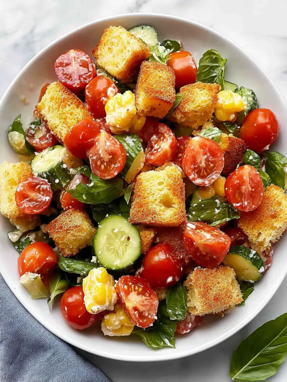Enjoy a refreshing Cornbread Panzanella Salad, perfect for summer gatherings, blending sweet cornbread with vibrant vegetables.