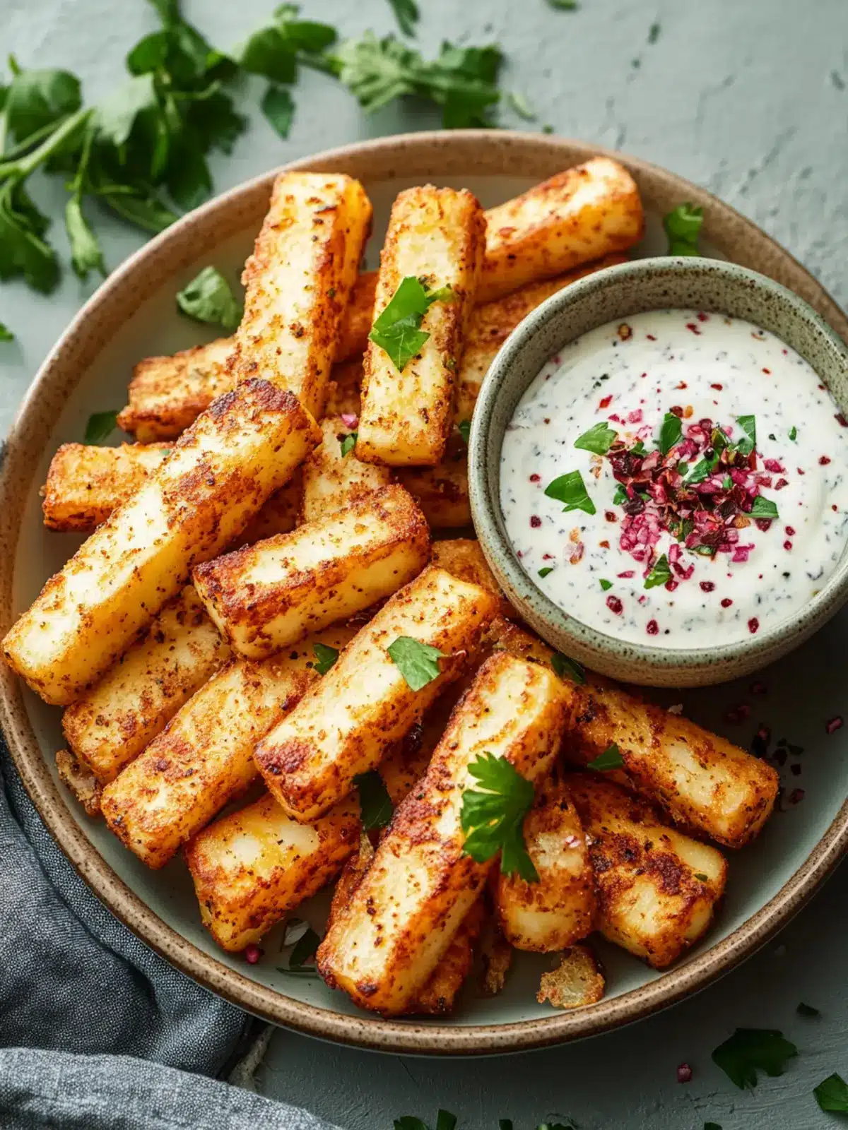 - Serve the warm, crispy Halloumi fries with the spicy yogurt dip, garnished with fresh herbs.