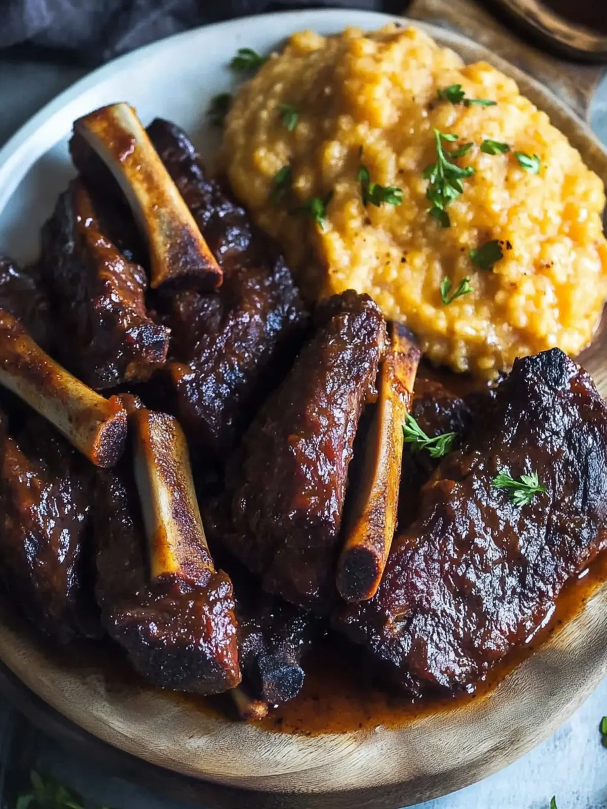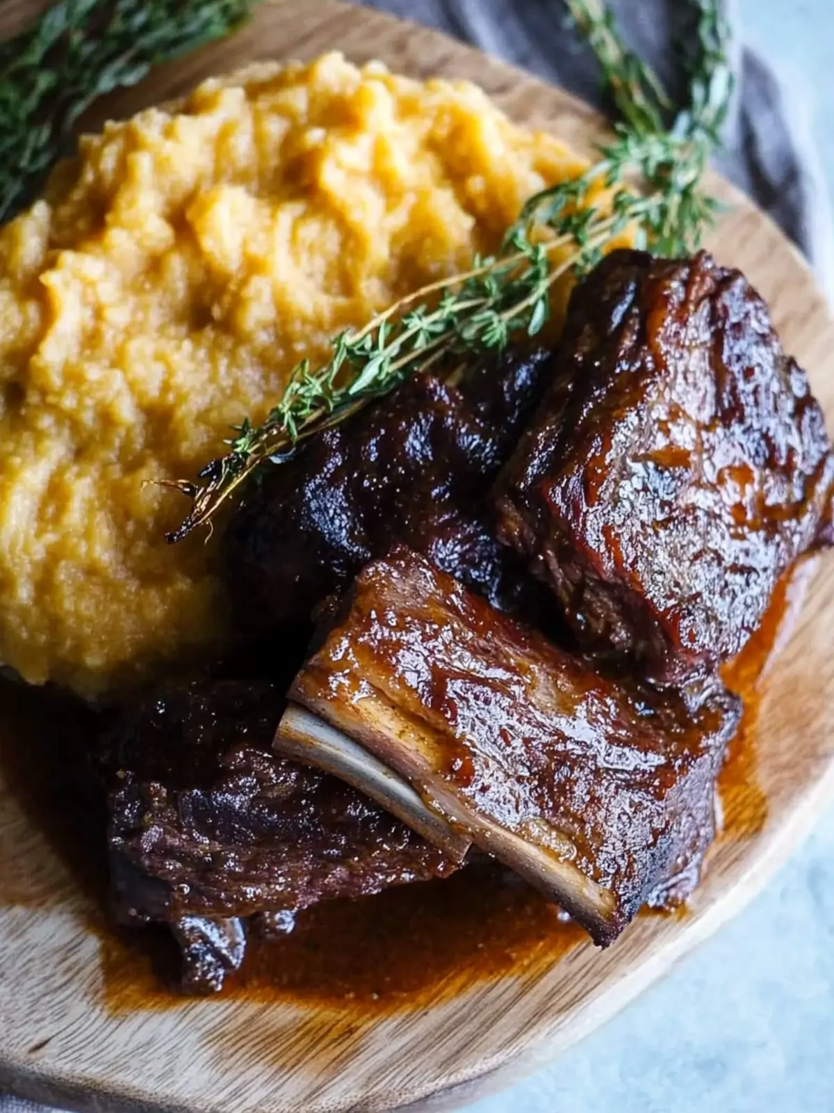 Serve: Plate your melt-in-your-mouth short ribs with a generous serving of mashed sweet potatoes. Drizzle the luscious cooking liquid over the top for an unforgettable finish.