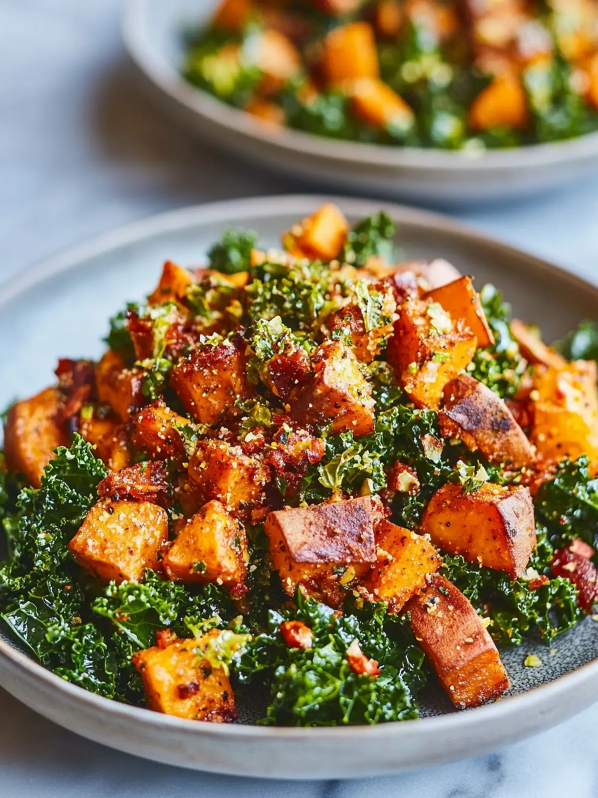 - Toss the roasted sweet potatoes and chickpeas with the massaged kale. Add everything to a serving bowl and finish with chopped parsley and optional chilli flakes.