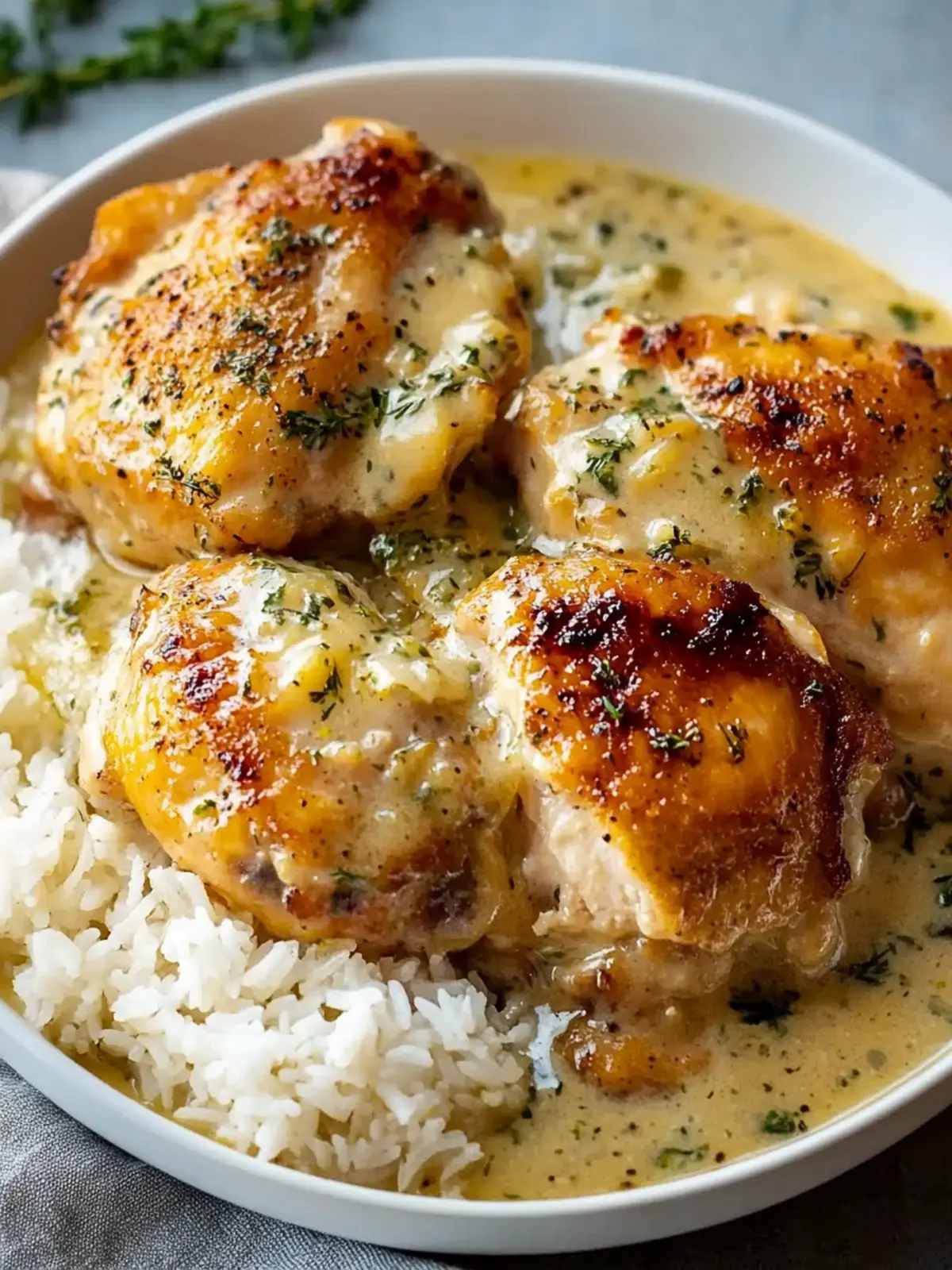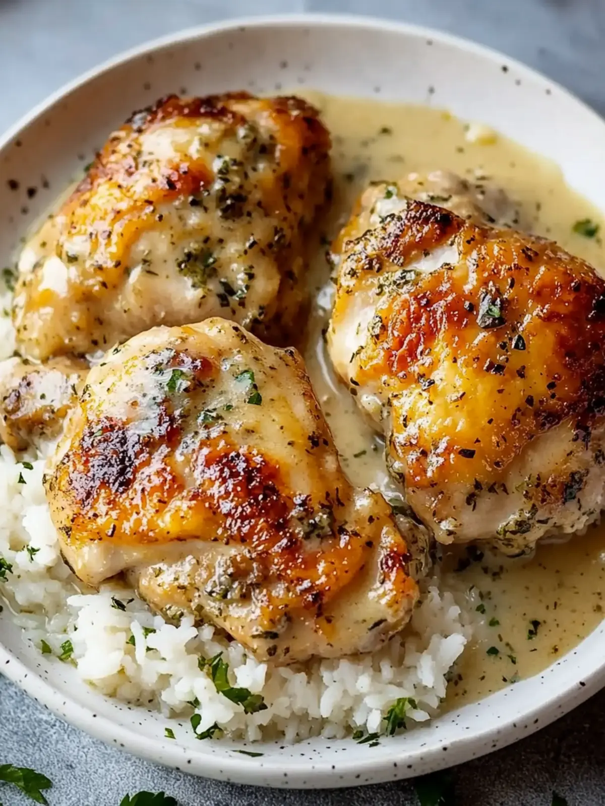 Experience the bliss of crispy golden herb-crusted chicken thighs in creamy garlic sauce, served over rice; a comforting weeknight dinner.