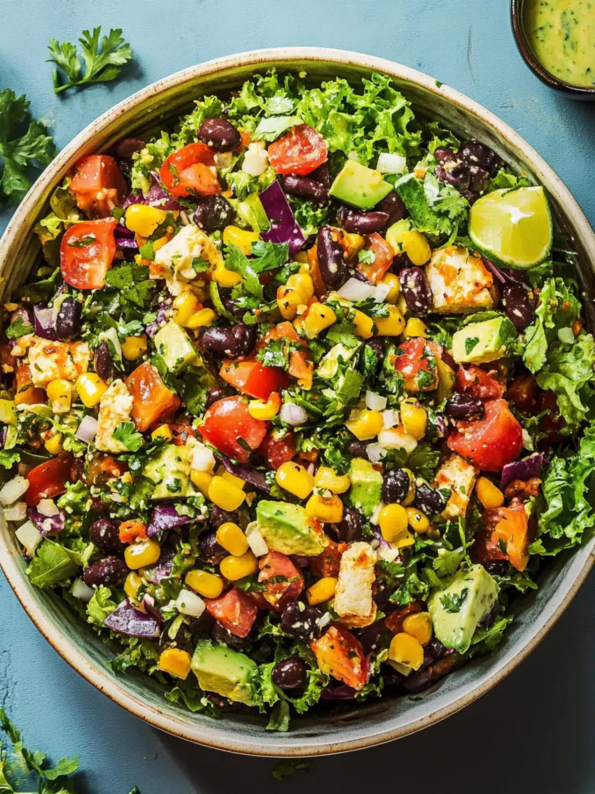 - Serve with flair: Divide the salad among serving bowls. Top each with the remaining tortilla chip crumbles, sliced avocado, extra cilantro, and a wedge of lime. Slice the baked chicken and serve it on top or beside the salad for a satisfying meal.