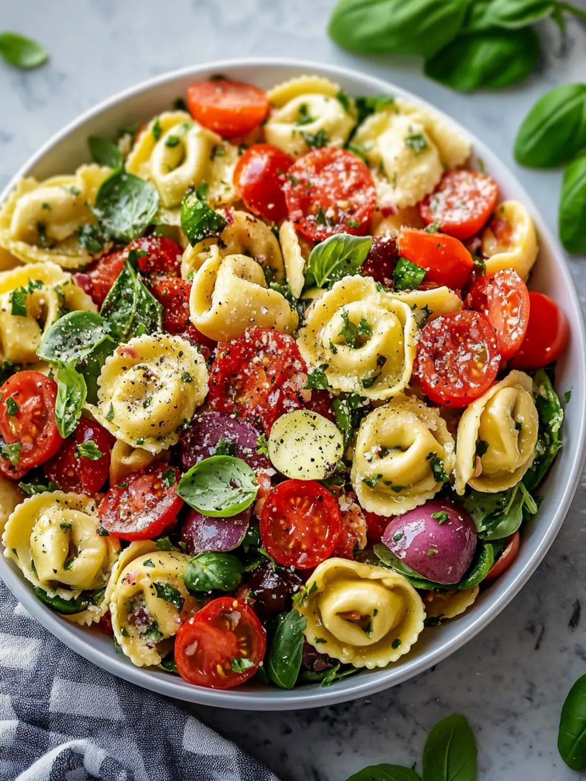 - Combine Ingredients: In a large mixing bowl, combine the cooked tortellini, chopped vegetables, and fresh herbs. Stir gently.