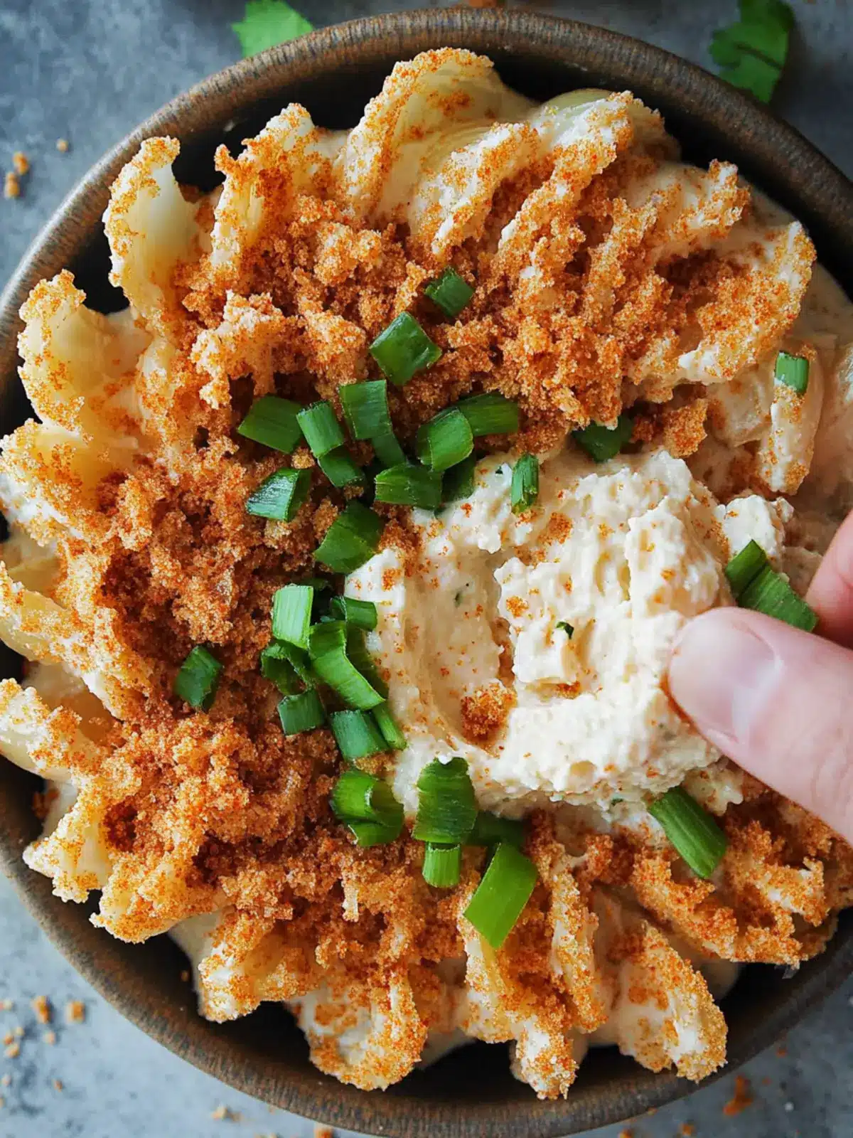 8. Serve: Once ready to serve, dish out the creamy dip into a bowl, generously sprinkle the crispy panko on top, and garnish with chopped green onions to add a fresh touch.