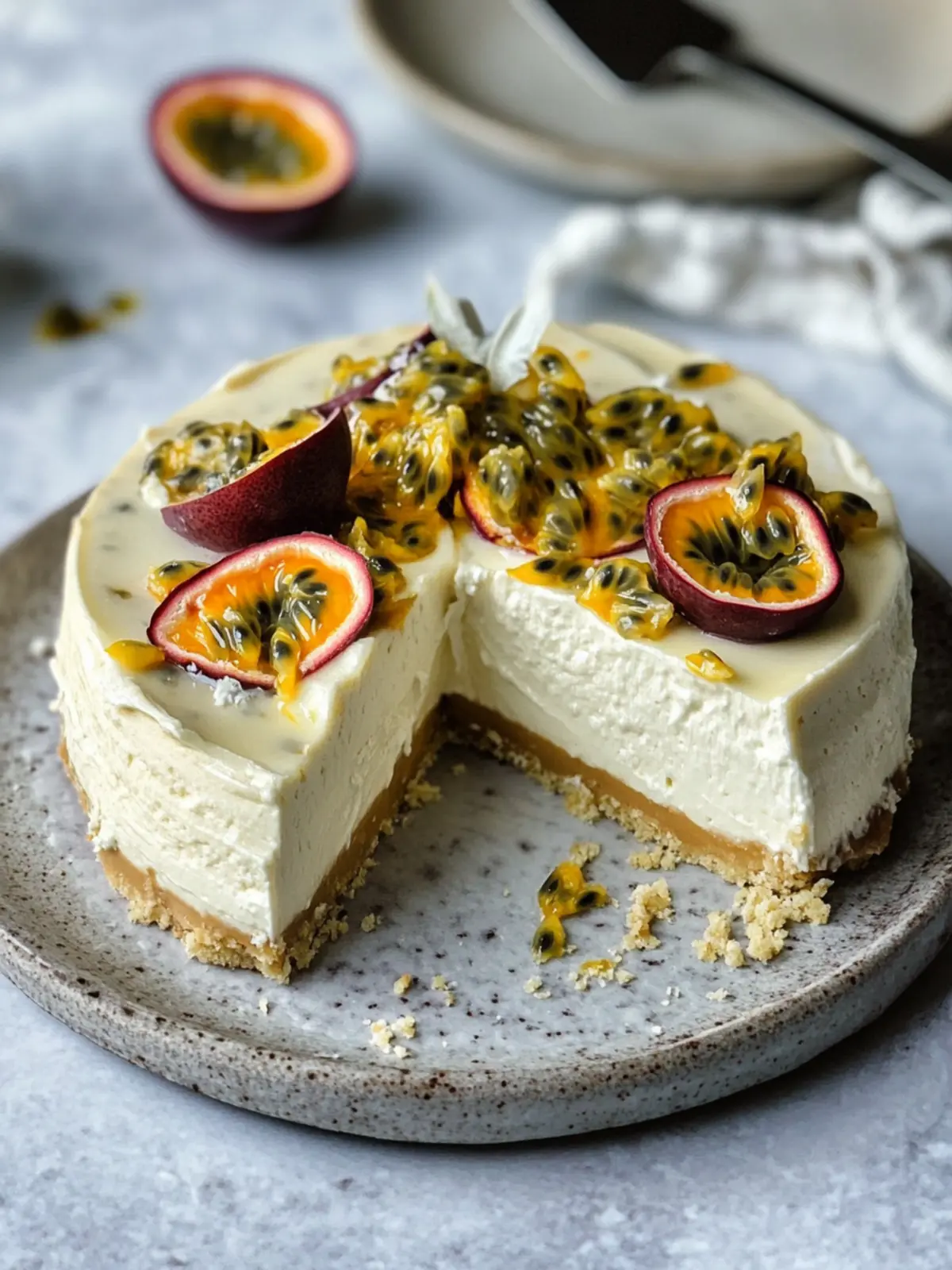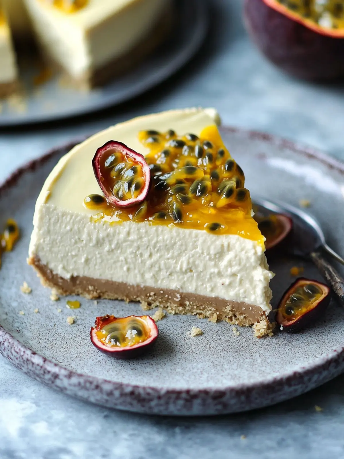 Impressive presentation: Topped with silky cream and passion fruit pulp, this cheesecake looks as stunning as it tastes, perfect for impressing guests.